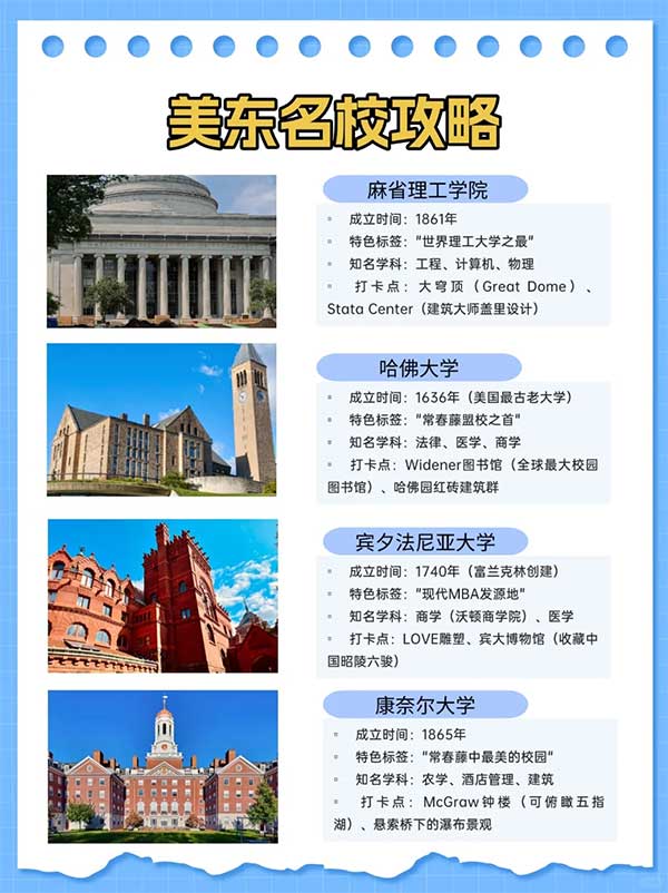 🌸名校打卡點:麻省理工 Stata Center、哈佛 Widener 圖書館、賓夕法尼亞大學富蘭克林像、康奈爾大學《星際迷航》取景地…..