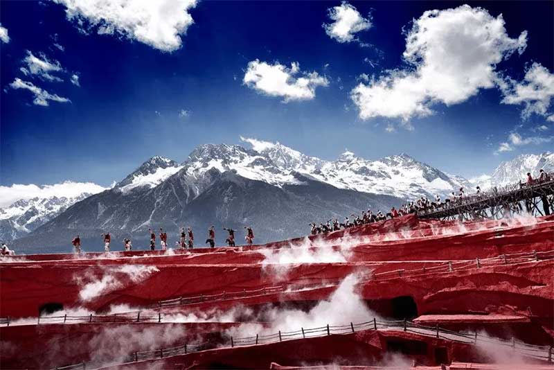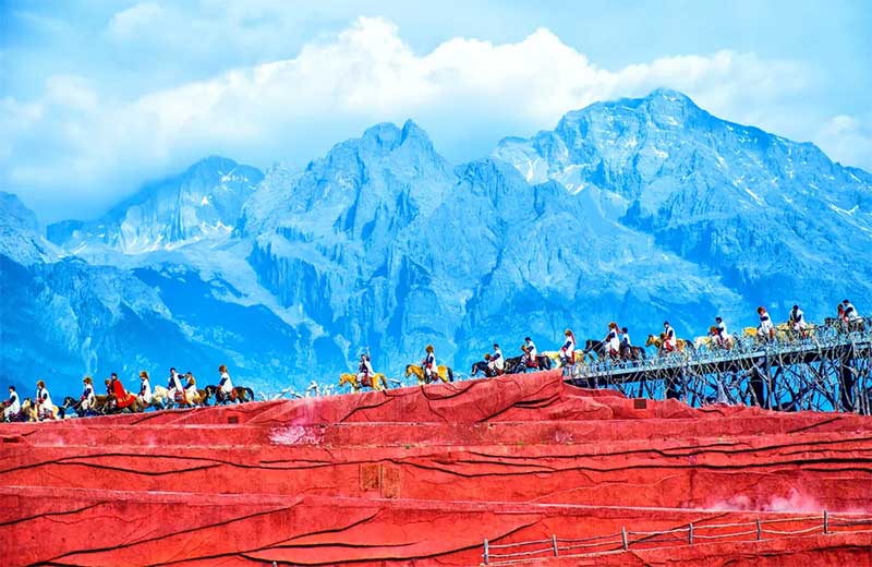 500餘名少數民族農民演員,百匹駿馬在紅色沙石舞台上奔騰,以玉龍雪山為背景,海拔3100米的露天劇場……這就是張藝謀導演打造的《印象麗江》。
